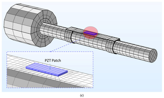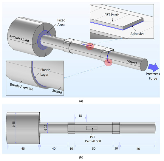 As shown in Figure 7a, the finite element model is a segment of the smart strand (160 mm in length) equipped with an impedance device. The PZT patch (type 5A) is bonded on the top surface of the flexible section of the impedance device via a bonding layer (thickness of 0.1 mm), and the whole piezoelectric device is attached to the strand using two elastic layers (thickness of 0.1 mm). A part of the anchor head is fixed while the PS load is applied to the other end of the strand, as shown in Figure 7a. The geometry of the finite element model follows the actual sizes of the previous experimental structure, as presented in [2] and sketched in Figure 7b. The meshed finite element model is shown in Figure 7c. To mesh the model, we used the user-control meshing type in the COMSOL program with finer meshing for the PZT patch and the impedance device. The meshed model includes 1828 elements (756 prism elements and 1072 hexahedral elements).