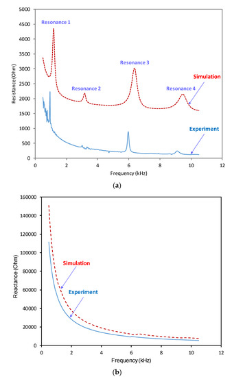 Electromechanical impedance response of the smart strand: simulation vs. experiment. (a) Real impedance (Resistance); (b) Imaginary impedance (Reactance).