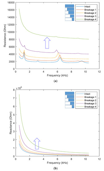 In order to model the PZT breakage defect, the length of the PZT transducer in the finite element model was reduced by 20% (breakage 1), 40% (breakage 2), 60% (breakage 3), and 80% (breakage 4). The resistance, the reactance, and the susceptance of the smart strand under the healthy state and four spalling cases of the PZT transducer are shown in Figure 10a–c, respectively. It is observed that the whole resistance curve significantly shifts up according to the amount of transducer spalling, see Figure 10a. While the frequency of the first resonance remains quite stable, that of the third resonance visibly decreases. These observations contradict those observed from the resistance curve in the previous study [24]. It is also noticed that the resonances become less sharp as the spalling size increases. When the spalling severity reaches 80%, the magnitude of the resonances becomes negligible.