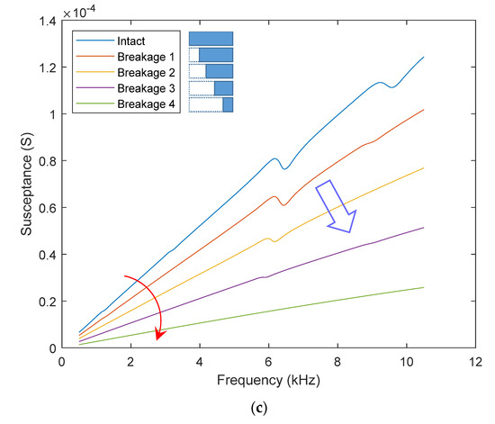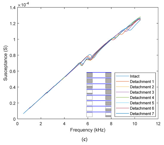 However, the reactance curve in Figure 11b shows a contradictory trend with the previous observation. The reactance response of the smart strand remains nearly unchanged despite the disbond of the PZT transducer. Meanwhile, in [19,24], the PZT debonding causes downward shifts in the reactance curve. Although there exist some visible variations in the frequency band of 6–10 kHz, the slope of the susceptance response generally remains stable under the disbond of the PZT transducer (see Figure 11c). This result contradicts the previous observation [19,24], which shows a decreased susceptance slope due to the debonding effect.