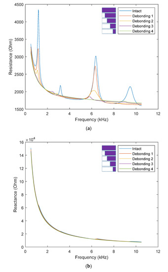 It is known that the mechanical coupling between the PZT transducer and the host structure is dependent on the shear modulus of the bonding layer [52]. When the modulus rate reaches an ignorable value (10−6), no piezoelectric strain is transferred from the PZT to the flexible section, and no contribution of the structural impedance (Zs) is contributed to the overall impedance (Z), according to Equation (1). Therefore, all resonances of the impedance device are disappeared from the resistance curve. As shown in Figure 12c, the susceptance part, which is commonly used to diagnose the PZT transducer, shows an increased slope due to the shear-lag phenomenon. This observation is well-agreed with the previous study [25].