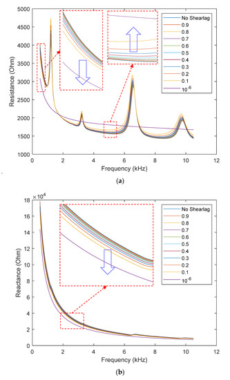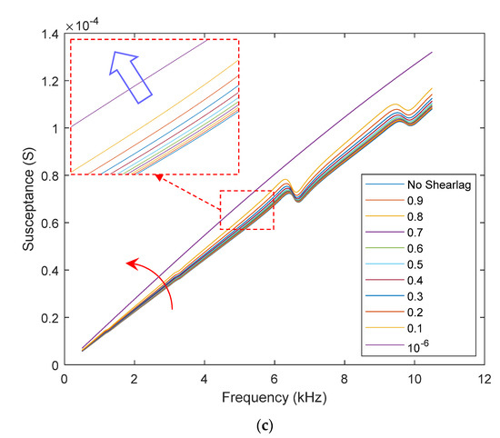 We modeled the shear-lag phenomenon of the PZT transducer by reducing the shear modulus of the adhesive layer in the finite element model. Ten cases of the reduced shear modulus were simulated with the modulus rate from 0.9 to 0.1 (0.1 steps) and 10−6. The simulated resistance, reactance, and susceptance parts are shown in Figure 12a–c, respectively. The shear-lag phenomenon causes minor changes in the peak frequency, as observed in Figure 12a. Interestingly, some parts of the resistance curve shift down while the other parts shift up. These observations contradict those observed on other piezoelectric devices [24,25]. Although the shear-lag also induces downward shifts in the reactance curve, the shifts are inconsiderable in comparison with the previous observation [24].