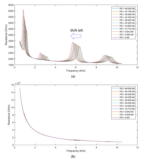 Equation (5) shows that the electromechanical impedance of the smart strand shall vary with the PS load. Once the sweep frequency matches the natural frequencies of the sensing device, resonant peaks appear in the impedance spectrum, as proved by Equation (2). Therefore, the resonant impedance peaks shift along with the variation of the PS load. The previous studies show that by quantifying those variations, it is feasible to accurately monitor the PS load and estimate the severity of PS change [2,8].