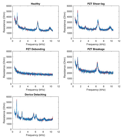 White noises with different levels of 1–8% (1% step) were added to construct the training datasets. This is for the consideration of real measurement conditions in which electrical noises are unavoidable. It is noted that the noise percents are the standard deviations of the signal amplitude. Totally, three corresponding testing datasets TestD1 (the resistance dataset), TestD2 (the reactance dataset), and TestD3 (the susceptance dataset). The sample noise-contaminated resistance signals of the testing dataset (TestD1) are shown in Figure 15. The added white noises cause visible shifts in the resistance curves. Each of the three testing datasets has 288 signals, comprising 32 signals for the PZT breakage class, 32 signals for the PZT disbond class, 80 signals for the shear-lag class, 56 signals for the device detachment class, and 88 signals for the healthy class (8 intact + 80 PS-loss).