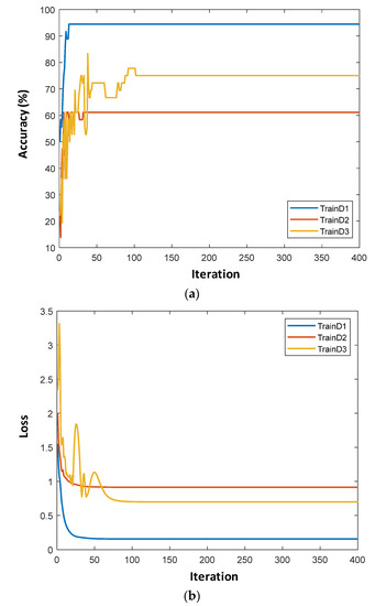 Figure 16a shows the training accuracy of the 1D CNN model for different training datasets (TrainD1–TrainD3). The network trained on TrainD1 (the resistance response) yields the highest accuracy (94.4%), while TrainD2 (the reactance response) shows the lowest accuracy (61.1%), and the training accuracy for TrainD3 (the susceptance response) is relatively high (75%). The training loss of the 1D CNN for different training datasets (TrainD1–TrainD3) is shown in Figure 16b. After the 400 iterations, the loss of the network is significantly reduced. The network trained on TrainD1 shows an ignorable loss value (only 0.15) which is the lowest among the three datasets. TrainD2 shows the highest loss at 0.91 while that for TrainD3 is 0.70.