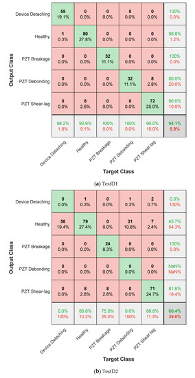 The network trained on the dataset TestD2 (the reactance response) continues to show the lowest overall testing accuracy, merely 60.4% (see Figure 17b). Besides, the trained network completely failed to distinguish the device detachment and the PZT debonding from the healthy class. This is due to the nature of the reactance data. As shown in Figure 11b, Figure 13b, and Figure 14b, the reactance response remains almost the same regardless occurrence of the faults.