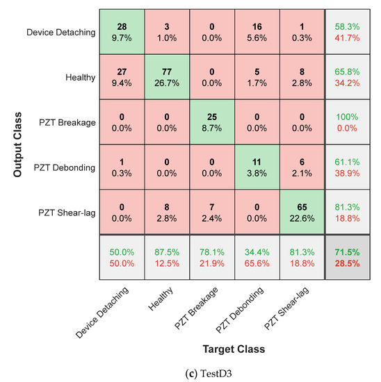 The testing accuracy of the network trained on the dataset TestD3 (the susceptance response) is presented in Figure 17c. The overall accuracy accounts for 71.5%. Although the accuracy for TestD3 is higher than that for TestD2, the trained network is not able to accurately classify the healthy, the PZT debonding, and the device detachment classes, as observed in Figure 17c.