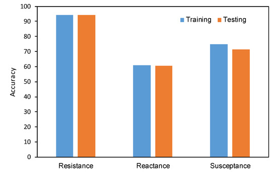 Figure 18 summarizes the training and testing accuracies of the network trained on the three responses. It is shown that the testing accuracy is slightly lower than the training accuracy. Among the three examined responses, the reactance response is found as the most suitable response for the fault assessment in the smart strand, with superior accuracy compared to other responses.