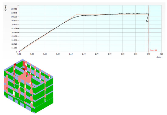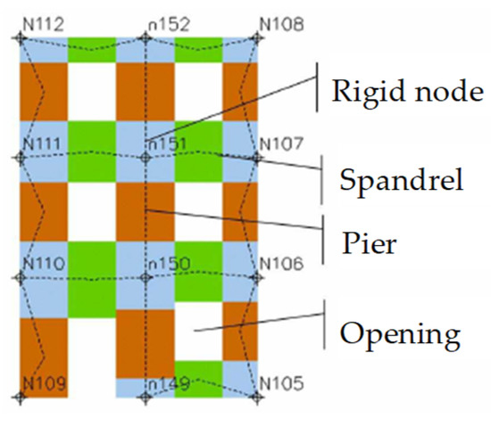 It is a calculation program allowing for linear and non-linear static analyses to assess the degree of vulnerability of both new and existing structures made of either masonry or mixed masonry-RC structures. TreMuri is based on the “Frame by Macro Element” (FME) method, where the walls are schematized with “macro-elements”, i.e., portions of masonry having a defined behaviour. They in turn are subdivided into elementary components, namely masonry piers, spandrels and rigid nodes. As shown in Figure 7, masonry piers (in brown) represent the vertical part of masonry next to the openings, the spandrels (in green) correspond to the portions above and below the openings, and rigid nodes (in cyan) are those masonry parts connecting piers and spandrels which remained undamaged by seismic events. Therefore, they can be considered infinitely rigid compared to the other elements and so are modelled with elements of infinite stiffness.