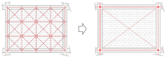 The modelling was carried out by inserting, for each masonry pier of each floor, a frame equipped with steel braces laid out in a St Andrew’s cross pattern. The bracing system has a cross-section equivalent to the contribution of all the diagonals present in the considered masonry panel area, as shown in Figure 13.