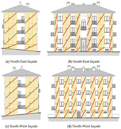 Identification of masonry panels and corresponding equivalent diagonals on the building facades (North-East (a), South-East (b), South-West (c) and North-West (d)).