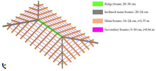 The existing roof is made of a wooden structure with four inclined pitches. The intervention involves its replacement with a new structure made of GL32h laminated timber maintaining the same original geometry. Fistly, following the demolition of the existing roof beams, the damaged areas of the existing masonry walls are restored through the “scuci and cuci” technique. Later on, the erection of the new beams is foreseen. In particular, three different sections are used: 20 × 24 cm for the ridge beam, 16 × 24 cm for the main beams and 8 × 10 cm for the secondary beams. Figure 17 shows all the designed section.