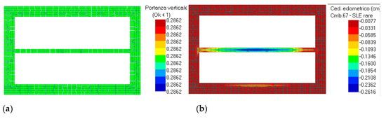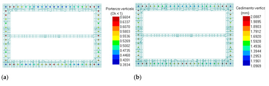 The design of this intervention was carried out with the finite element analysis calculation software Pro_Sap. In Figure 18 and Figure 19 the synthetic verification, together with the calculation of the bearing capacity and the subsidence check of the foundation FEM model of the original structure, is shown. The same results are depicted in Figure 20 and Figure 21 for the micropiles and beams, respectively, of the reinforced foundation structure.