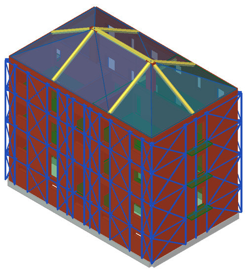 As in the investigation on the bare building, the TreMuri software is used for vulnerability analysis of the retrofitted numerical model of the building, based on the design of interventions previously described. In Figure 22 it is possible to observe the steel frame with the equivalent diagonals representative of the Resisto 5.9 system installed on the building facades.
