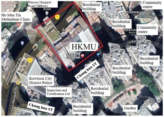 A typical classroom in Hong Kong Metropolitan University (HKMU) was selected as the target classroom. The campus of HKMU was built in 2003 in Hong Kong (latitude: 22.33° N and longitude: 114.19° E). Figure 1 shows the geographical location of HKMU. The campus is located in an urban area without major traffic roads surrounding the campus. Near HKMU, most of the buildings are residential buildings, and there are no industrial buildings that can produce enormous pollutants that affect the outdoor environment around the campus. Thus, the noise and pollutants near the campus keep at low levels, providing a comfortable learning environment for students. This building is certificated with a Gold level by the Building Environmental Assessment Method (BEAM) released by the Hong Kong Green Building Council (HKGBC), including the demolition, planning, design, construction and commissioning of a new building project.