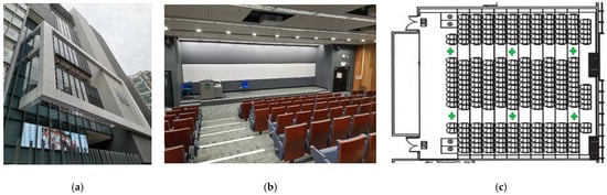 Exterior and interior appearance of the HKMU and selected classroom (a) Exterior view; (b) Interior view; (c) layouts of seats and sampling positions.