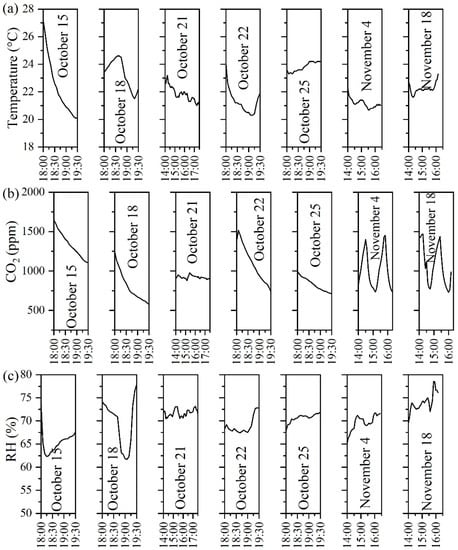During the measurements, the indoor Top for the classroom ranged from 20.1 to 27.2 °C, RH from 61.7 to 78.6%, CO2 from 575.9 to 1652.4 ppm, and va from 0 to 0.79 m/s. Students’ activities in the classroom affected the IAQ significantly, especially the CO2. To further demonstrate the hourly variations of the indoor parameters during the class period (with students and teachers as occupants), Figure 3 depicts indoor Top, CO2, and RH profiles for each indoor experiment.