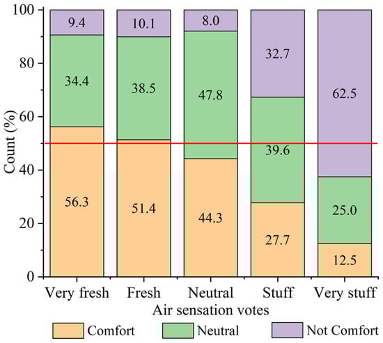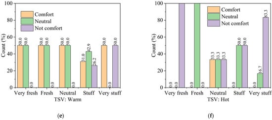 When the TS was “Cold” as shown in Figure 6b, even though the AS was “Very fresh”, the students still felt “Not comfort” with a proportion of 9.0%. As the AS tended to be terrible, the proportions of “Not comfort” got higher correspondingly, increasing from 9.0% to 100.0%. While the proportions of “Comfort” decreased gradually, declining from 52.4% to 6.7%. In AS classification “Very stuff”, all the students voted “Not comfort”. In Figure 6c–e, when the TS was “Cool”, “Neutral”, and “Warm”, the proportions of “Not comfort” in each AS classification were kept at low levels. For students who voted “Hot” in Figure 6f, the “Not comfort” proportions in each classification were kept at relatively high levels, indicating that the terrible thermal conditions influence the AS significantly, causing the bad sense of the IAQ.