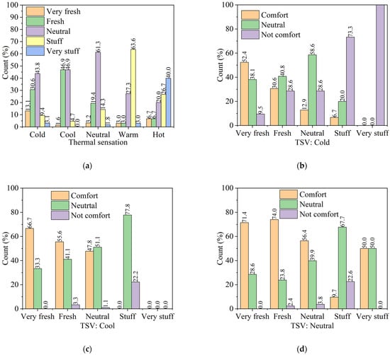 The total proportions of “Very fresh”, “Fresh”, and “Neutral” are defined as acceptable AS proportions, while the rest scales are defined as unacceptable AS proportions. As shown in Figure 6a, when the TS was “Cold”, “Cool”, “Neutral”, “Warm”, and “Hot”, the corresponding acceptable AS proportions were 87.5%, 95.3%, 83.9%, 33.3%, and 33.3%, respectively. The acceptable AS proportions of “Cold” and “Cool” voted by students were huger than those of “Warm” and “Hot”. Thus, it can be concluded that a relatively cool environment can improve AS and the durability of terrible IAQ.