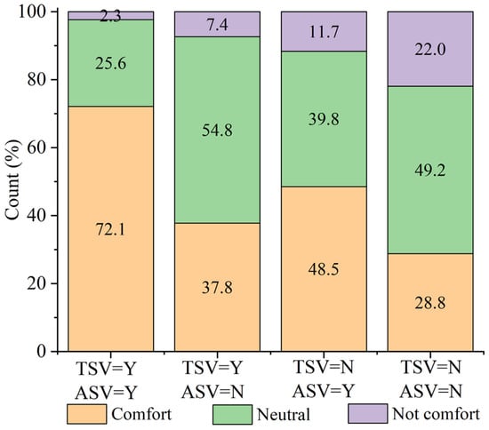 When the TS and AS were both “Y”, the comfort proportion reached 72.0%, and the “Neutral” and “Not comfort” proportions were 25.6% and 2.3%, respectively. Comfortable indoor thermal conditions with better IAQ can improve indoor comfort sensations. When the TS was “N” and AS was “Y”, the comfort proportion reached 48.5%. In contrast, When the TS was “Y” and AS was “N”, the comfort proportion was only 37.8%. It can be concluded that the students were more sensitive to the AS rather than the TS.