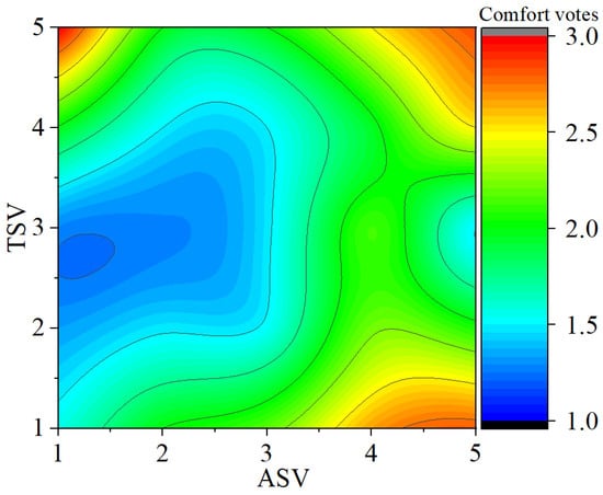The results in Figure 8 show that students prefer a relatively cold indoor environment. According to the participating students, a TS of 2.5–2.9 and an AS of 1–1.5 are most comfortable. Moreover, it was also found that dissatisfaction with only TS or AS does not result in significant overall discomfort unless that value is extremely unacceptable. For instance, when the TS ranged from 1.5 to 4, even if the AS was 5, most students still voted 1.5 to 2.5 for indoor comfort sensation. However, when the TS was 5, even if the AS was identified as 1, students felt uncomfortable, with comfort sensation votes of 3. When the TS and AS were both unacceptable, e.g., a TS of 5 with AS of 5, students had a high probability of feeling uncomfortable.