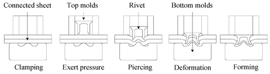 Cold-formed steel (CFS) structures have the characteristics of lightweight and high strength, environmental protection, and a high degree of industrialization and assembly, which have been widely used in low and multi-rise buildings [1]. The self-piercing riveted (SPR) connection is a common sheet connection technology in the field of mechanical engineering, which has the characteristics of high bearing capacity, large stiffness, and good fatigue resistance; its connection efficiency and degree of automation, especially, are extremely high [2]. The prototyping mechanism of a SPR joint is illustrated in Figure 1 [3]. Under the action of pressure, the top sheet is pierced by the SPR joint, and the bottom sheet is pierced but not penetrated. Then the rivet skirt is spread under the guidance of a suitable die. An interlock mechanism is formed with the deformed sheets. Therefore, the two connected sheets transfer force through the interlock mechanism; this provides good shear and tensile strength for the SPR connection. Therefore, the SPR has good application potential in CFS structures, while its performance directly affected the structural performance of the component and overall structure [4]. Therefore, the effective simulation of SPR connection directly affected the accuracy of the FEA for the entire component. Currently, numerical simulation researched on the SPR connection is mainly based on the simulation of a refined finite element model to predict shear strength, the failure mechanism, and fatigue performance [5,6,7,8], but there are few studies on the simplified model of nonlinear FEA for SPR connection. Additionally, the complex structure of the SPR joint is extremely complicated to build the refined model, and the analysis is extremely nonlinear, resulting in low efficiency and excessive time consumption of the FEA for the entire component. In addition, the structural components may require hundreds or thousands of joints, making it impossible to consider each SPR in the structure by using the refined finite element model. Therefore, it is necessary to study a simplified method of nonlinear FEA to effectively simulate the mechanical properties of the CFS-SPR connections.