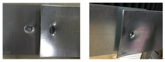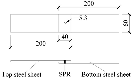 In this paper, taking into consideration steel sheet thickness, thickness ratio, and rivet length, six groups of CFS-SPR connection specimens were designed and manufactured, and each group of specimens was repeatedly tested with three samples. The specimens were a combination of 0.8, 1.0, 1.2, and 1.5 mm thick galvanized steel sheets. The material used for the sheets was DX51D + Z275 galvanized thin-walled steel, where “DX51D” is the number of the type of steel (acc. to EN 10142 mat. number), and “Z275” is hot galvanized with coating 275 g/m2. The length of the steel sheet was 200 mm, and the width was 60 mm for the specimens. According to China specification JGJ 227-2011 [24], the end distance of the rivet was determined to be 16 mm. The test specimen of the CFS-SPR connection is shown in Figure 2.