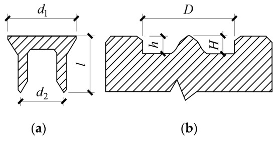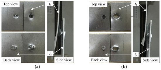 The main failure modes of CFS-SPR connection specimens under shear loading can be summarized as follows: (I) The rivet tail pulled out from the bottom sheet (see Figure 5a), and (II) the rivet head pulled over from top sheet (see Figure 5b). Table 2 presents the mechanical parameters for the six groups of CFS-SPR connection specimens.