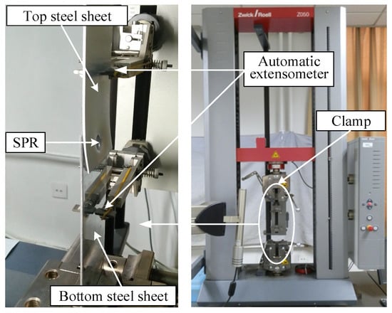 The shear performance test of the CFS-SPR connection was conducted on a Zwick/Roell Z050 testing machine equipped with an automatic extensometer, and the testing machine capacity was 50 kN (shown in Figure 4. The extensometer had a travel distance of 10 mm, which allowed the measurement of the elastic and plastic slip in the connections, and the gauge length was determined as 100 mm to measure the elongation. The monotonic loading with a loading speed of 3 mm/min was conducted [24]. The load–displacement curves were recorded and the failure modes were observed in the process of testing.
