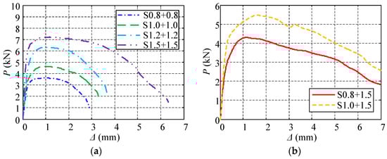 Figure 6a shows the load–displacement curve for the specimens under failure mode I. Test phenomenon indicate that the failure process of the specimens under failure mode I can be simplified into three stages: (1) Elastic stage: the top and bottom steel sheets and the fastening mechanism of the CFS-SPR connection are in the elastic stage, and the load–displacement shows a linear growth relationship. (2) Plastic stage: the end of the top steel sheet begins to warp and deform, plastic deformation appears in the fastening mechanism. The load–displacement curve tends to be a horizontal stage. (3) Failure stage: severe plastic deformation occurs on the hole-wall of the top sheet, and the rivet is tilted and gradually pulled out from the bottom sheet. The load–displacement curve shows a sharp downward trend.