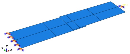 For the simplified analysis model, the preload generated from forming the SPR joint was ignored. The fastening force between the rivets and the friction between the two steel sheets were simplified to the shearing behavior of the connection area between the steel sheets. Figure 7 presents the boundary conditions of the simplified analysis model. All the nodes at the end of the bottom sheet release the degrees of freedom Rz rotating around the Z axis, while all the nodes at the end of the top sheet release the degrees of freedom Rz rotating around the Z axis and the flat movement degrees of freedom Ux in the X direction (loading direction); the remaining degrees of freedom are all constrained. The nodes at the end of top steel sheet were coupled to a reference point which released the constraint in the X direction, and then a displacement was applied to the reference point in the X direction to achieve loading the model.