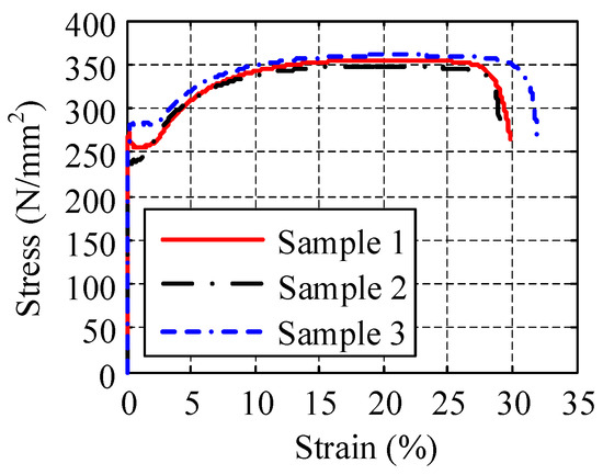 Based on the Chinese Standard of Metallic Materials—Tensile Testing at Ambient Temperature (GB/T228.1-2010) [25], three sets of samples from each sheet thickness were used for the tensile test, and the material properties were the average of three sets of test data. Figure 8 presents the stress–strain curves for three sets of samples for the 1.5 mm steel sheet. Table 3 and Table 4 list the test results of material properties for the 1.5 and 0.8 mm steel sheets, including yield strength (fy), tensile strength (fu), ratio of tensile strength to yield strength (fu/fy), elastic modulus (E), and elongation (S).