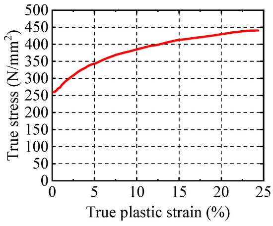 The stress–strain relationship for the steel sheet obtained through the material properties test was typically the nominal stress and the nominal strain of the material. However, the material nonlinearity and geometric large deformation need to be considered in the FEA of the SPR connection. Therefore, it is necessary to convert the nominal stress and nominal strain of the material into true stress and true strain [26]. Figure 9 shows the constitutive relation between the true stress and the true plastic strain obtained by using the conversion Equations (1) and (2). On the basis of plasticity fundamentals, Equations (1) and (2) are valid only while the material is stable (before the material necking).
