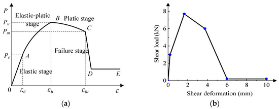 When the SPR connection used link elements, such as the connector and the spring to simplify the simulation, it was necessary to input the constitutive relation for the connection element between the two nodes. The constitutive model of the link element was simplified according to the load–displacement curves of the shear performance test results for the CFS-SPR connection presented in Section 2. The simplified principle is presented in Figure 10a, and it demonstrates that the constitutive model of the link element can be simplified into five stages: (1) Elastic stage (OA): used to simulate the elastic behavior of the SPR connection that was to transmit force through the fastening mechanism; (2) Elastic–plastic stage (AB): used to simulate the elastic–plastic behavior caused by the warping deformation of the top steel sheet and the tilting of the rivet; (3) Plastic stage (BC): used to simulate the slip behavior between the rivet and the steel sheet; (4) Failure stage I (CD): used to simulate the behavior of the rivet separating from the sheet, causing the connection to fail completely; (5) Failure stage II (DE): used to prevent the failure of an individual rivet from causing no convergence in the calculation of the overall model, so the DE segment of the curve was treated as a horizontal segment with negligible load. Figure 10b shows the constitutive model of the shear behavior of the SPR connection in the FEA.
