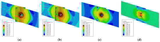 For the eight simplified methods of FEA described in Table 5, Table 6 and Table 7, finite element models were established in ABAQUS, respectively. The static solution of displacement loading was adopted, and the maximum loading displacement was set as 5 mm. The main mesh size of all simplified models for the CFS-SPR connection was 3 mm. However, for the finite element models modeled by the first simplified methods, the mesh of the area around the SPR joint needed to be more intensive. The Mises stress cloud diagrams of the eight finite element models are presented in Figure 11, the failure mode of test specimens is shown in Figure 12, and the shear load–deformation curves are illustrated in Figure 13.