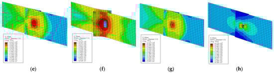 The Mises stress cloud diagrams and failure modes: (a) 1-1, (b) 1-2, (c) 1-3, (d) 2-1, (e) 2-2, (f) 2-3, (g) 3-1, (h) 3-2.