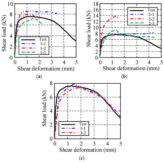 Shear load–deformation curves of the simplified model for the CFS-SPR connection: (a) first type of simplified model, (b) second type of simplified model, (c) third type of simplified model.