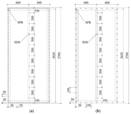 Specimens of CFS shear walls with SPR (mm): (a) W-1, (b) W-2.