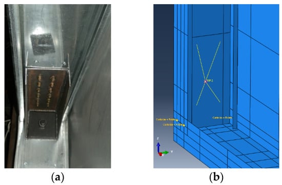 The SPR connection in the CFS shear wall could be divided into an equal-thickness connection between the stud and track in the CFS frame and an unequal-thickness connection between the CFS frame and steel sheathing. The test results showed that the SPR connection between the stud and track in the CFS frame did not appear to be damaged, while the SPR connection between the CFS frame and steel sheathing was seriously damaged [27]. Therefore, the simulation of the SPR between the members in the CFS frame could be simplified by using the constraint element Pin or Fastener, while the SPR between the CFS frame and sheathing simulation could be simplified by using the Cartesian connector or the Spring2.