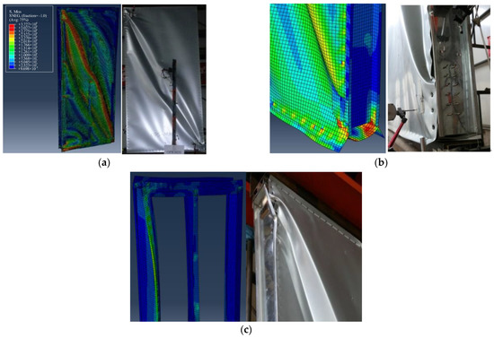 Comparison of failure modes between the FEA and the test results for specimen W-1: (a) shear buckling of steel sheathing and the pull-out of the rivet head from sheathing, (b) distortional buckling of the track, (c) bend-buckling of end stud.