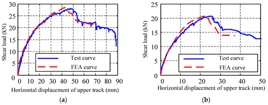 A comparison of load–displacement curves between the FEA and the test is presented in Figure 20. It can be seen that the trend of the load–displacement curves for the FEA and the test was basically similar; the FEA curves agreed especially well with the test curves in the elastic stage, the elastic–plastic stage, and the plastic stage. However, the descending stage displacement of the FEA curve was smaller than that of the test curve. The main reason was that the Cartesian connector was used to simulate the SPR connection, which the residual deformation of the hole-wall connected at SPR, and the deformation caused by the hold-down and shear bolt in the test wall could not be considered.
