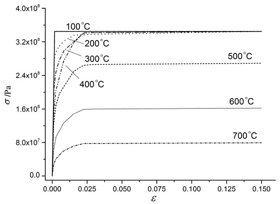 where is the temperature of the steel. The stress-strain relationship of steel at the elevated temperature is an elastic-plastic isotropic strengthening model; strengthening and neck shrinkage are ignored [21]. The multilinear kinematic hardening model is selected in ANSYS. The stress-strain relationships of steel at different temperatures are shown in Figure 2.