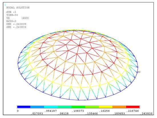 The finite element model is established by ANSYS; Beam188 is used to simulate the members, which is based on Timoshenko beam theory; it is well-suited for simulating the members of the latticed shell structure. The nodes are rigid connections; the bottom nodes are simply supported. The initial geometric defect is applied by the first-order mode of the structure. The large geometric deformation is turned on in the calculation. Temperature loads are applied to the structure in the form of body loads. Set multiple load steps with temperature changes, and the temperature value is set every minute according to ISO834. The FE model is shown in Figure 3.
