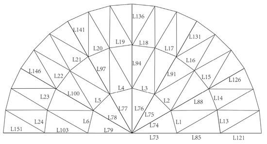 The positions of accidental loads are random, and the affected members are also uncertain. Due to the large number of members of the lattice shell structure, it is very important to traverse and calculate all members. In this study, the characteristic members are selected, and a temperature load is applied to one member to analyze the response law of other members of the structure. According to the symmetry of the latticed shell structure, the half-side structure is taken as a schematic, and the number of each member is shown in Figure 4.
