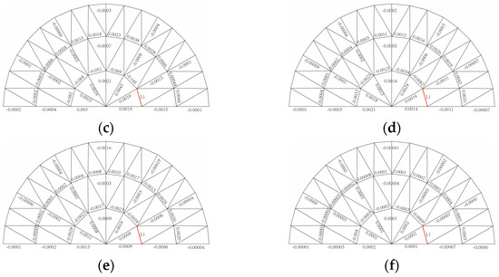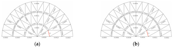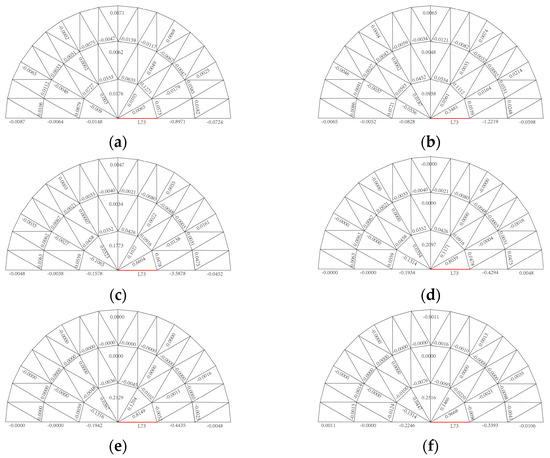 From the geometric point of view, the latticed shell structure is a perfectly symmetric structure, and it is representative of analyzing any circumferential member. Heating member L1, which is located at the first circular ribs, is heated to 500 °C. The sensitivity coefficients of the circumferential ribs, radial ribs, and diagonal braces are calculated and marked in Figure 8.