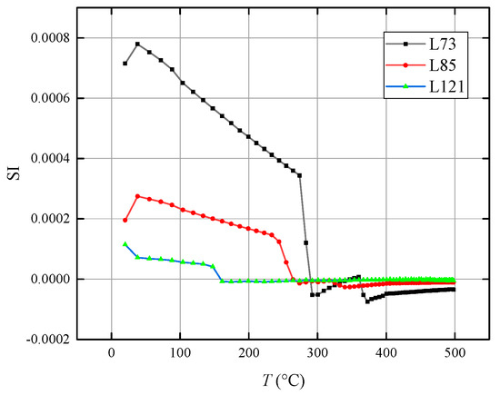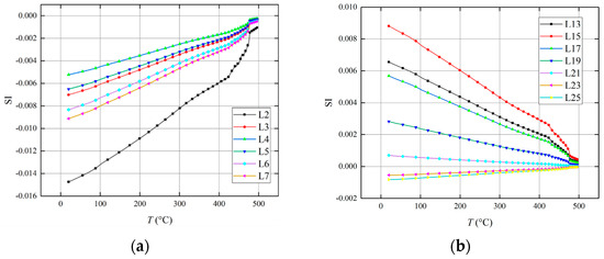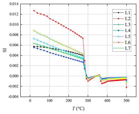 SI is a ratio of the stress increment to the stress margin, and the value range is (−1.0, 1.0); the larger the value is, the greater the member tends to be in a fully stressed state, and the smaller the capacity to continue bearing. When SI is greater than 1.0, it indicates the strength failure of member j. It is a mathematical certainty that the value of SI is a slope, which is the change rate of sensitivity with temperature. For the calculation results, SI can be either positive or negative; when SI > 0, it indicates that the internal force of the member will bear more load in the process of internal force redistribution; when SI < 0, it is a process of internal force release.