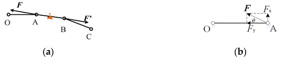 As shown in Figure 10, assuming that member AB is in fire, the unbalanced forces F and F’ are generated by the thermal effect at both ends of the member nodes, as shown in Figure 11a. The deformation of points A and B is constrained by other members, and the unbalanced forces F and F’ are transmitted to adjacent members through the nodes. A schematic diagram of force decomposition is shown in Figure 11b; the force component causes an increase in inertial force in OA, and causes a shear force and a bending moment. The shear force causes the upward displacement of point A. According to the same analysis, member BC can generate additional internal forces, and point B produces upward displacement. This process is the redistribution of local internal forces under temperature effects.