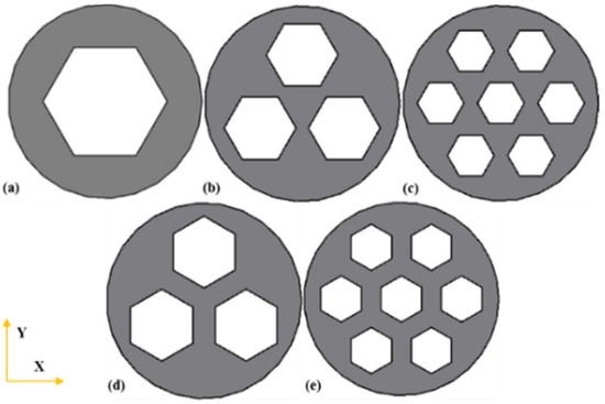 Internal structure configuration of honeycomb collision pier: (a) inscribing one concentric circle with a radius of 210 mm to propose one cut positive hexagon; (b) hollowing three circles out a radius of 121.24 mm (120° of distribution) to form internal square hexagons with a triangular-shaped central area; (c) inscribing seven circles at the radius of 79.38 mm at 60° distribution to produce the square hexagon along with a triangular-shaped central area; (d) rotate each square hexagon in (b) by 30° with center as the base point and terminally propose Y-shaped central area; (e) rotate each square hexagon in (c) by 30° to form Y-shaped central area.