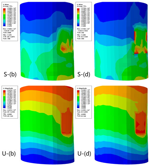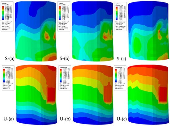 The phenomenon is attributed to the number of internal honeycombs, that enhances the interaction between the honeycombs and the energy absorbing and deformation buffering effects [27]. However, after exceeding the threshold, the structure would turn into an over-dispersed phase, weakening its force performance. In conclusion, as the difference in deformation between model (c) and the other two models does not exceed 5%, model (b) is more suitable for the construction of crash piers, considering its 87.6% maximum stress advantages.