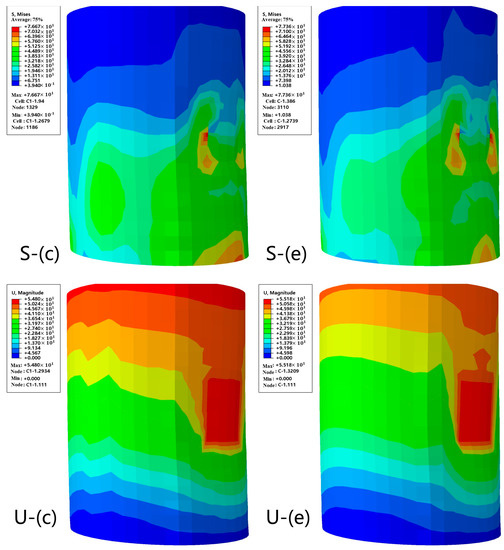 As shown in Figure 6, model (c) yields a maximum stress of 348.0 MPa, 11 MPa higher than model (e). However, model (e) obtains a 55.05 mm maximum displacement, which is 0.4 mm more than model (c) at 55.45 mm when subjected to a displacement load of 50 mm. In summary, model (e) has higher stress resistance and worse deformation performance and is more stable for internal structural optimization. The result verified the finding that when the solid central area is arranged in a triangular shape, the combined effect of force and deformation can be modified compared to a Y-shaped counterpart. This is because the solid triangular structure obtains outstanding stiffness toward fracture loading and deformation [31].